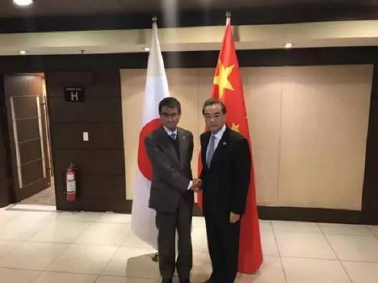 8月7日,王毅在菲律宾马尼拉出席东亚合作系列外长会期间会见新任日本外相河野太郎。