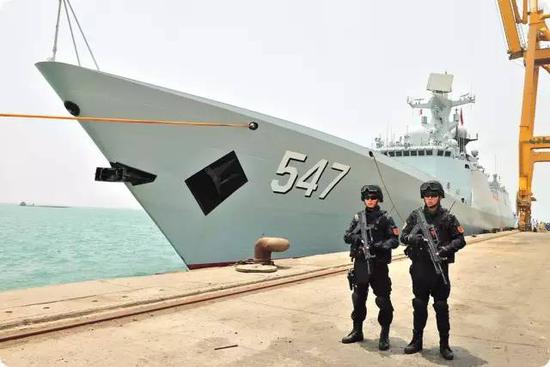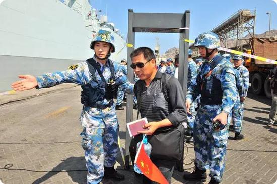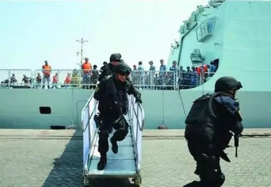 军舰靠岸后,全舰官兵一级战备,扶梯搭好后最先跑下来的20名海军陆战队特战队员迅速做好外围警戒。他们真的太帅了,与嘴里嚼着卡特,斜挎枪支的当地警察形成了鲜明对比。