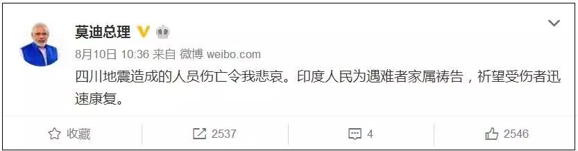 8月10日,印度总理莫迪通过其官方微博账号,发文对四川地震灾民表达慰问,称印度人民为遇难者家属祷告,祈望受伤者迅速康复。