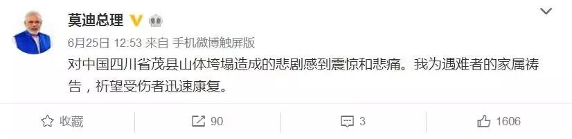 据了解,莫迪早在今年6月四川茂县发生地震后,也曾上微博向灾民表示关心和悲痛。