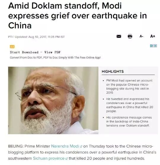 莫迪向四川地震灾民表达慰问正值中印洞朗紧张对峙时刻,不少印度网友对莫迪此举表示赞赏,网友纷纷表示“总理干得漂亮”,“这才是真正的印度人该有的人性本质”,“人道终究是第一位的,洞朗对峙很快就会平息”。