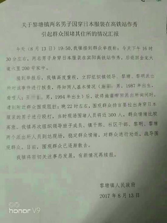 8月13日,宾阳县黎塘镇政府发布通告称,当天19时50分,接到举报称,两男子身穿日本服装在宾阳高铁站作秀,黎塘、黎明镇派出所对该事进行核查,得知两人基本情况(施谦,男,1987年出生,聋哑人;巫子富,男,1994年出生)后,欲将施谦带回派出所进行询问时,遭到围观群众阻拦,并扬言要拉出去进行殴打,当时围堵群众将近300人,“群众情绪比较高涨”。