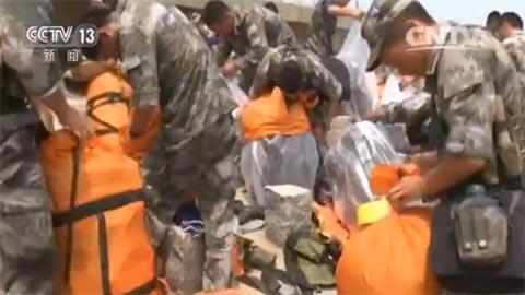 正午时分,官兵们为即将开展的3000米武装泅渡做准备,他们将背囊、钢盔、作战靴等装具放入防水袋中,扎紧系牢,并反复做着气密性检查。为减少泅渡时的阻力,他们还将自己的袖口、裤管用松紧带套住。