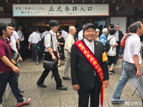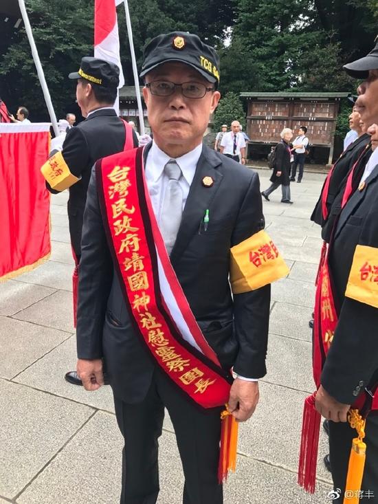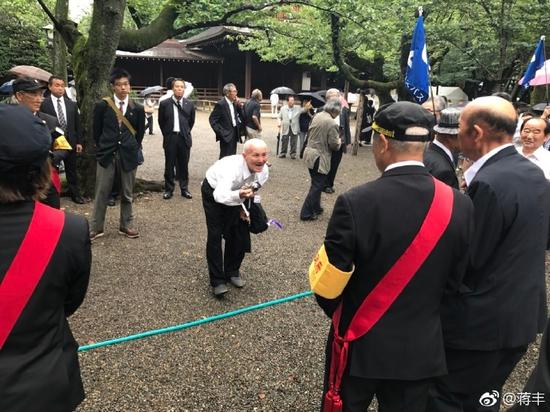 上午,日本华文媒体《日本新华侨报》总编辑蒋丰赴靖国神社,探访日本人对这个他们一直不愿承认的“战败日”是如何认识。据蒋丰微博消息,现场看到台湾“独派”组织“台湾民政府”成员前往日本靖国神社“拜鬼”,并在参拜靖国神社的入口处兴高采烈地拍照,并与日本人攀谈。