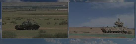 图为实弹射击前的红箭-10导弹发射车和坦克实物标靶。
