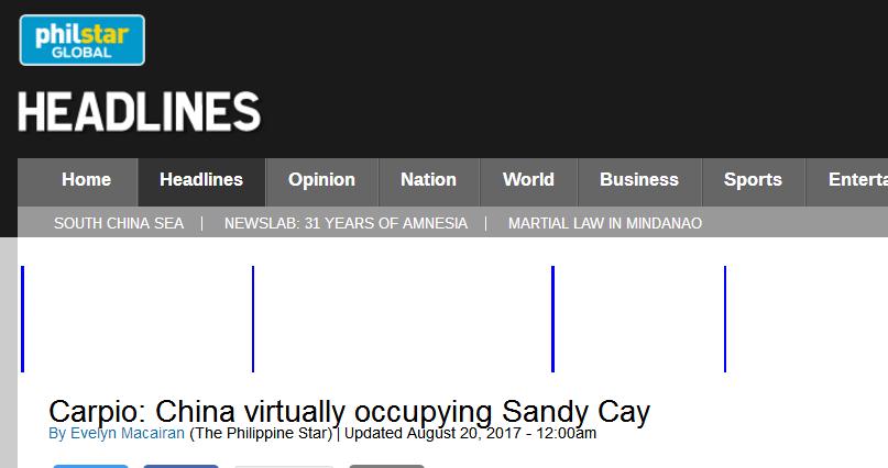 卡皮奥19日登上菲律宾各大媒体的头条,因为他发表声明严厉谴责“中国海军入侵并占领铁线礁(Sandy Cay)”,“这比黄岩岛发生的事更加糟糕”。他称,日前,两艘中国海军护卫舰、一艘海警船、两艘“军方捕鱼船”出现在铁线礁附近,进入中业岛12海里范围内。“总统杜尔尔特和外长卡耶塔诺至少应该严厉谴责中国的这一举动,要是他们有胆的话,就派一艘菲律宾海军舰船保护铁线礁;如果中国舰船敢攻击菲船只,就可以启动《美菲共同防御条约》。”