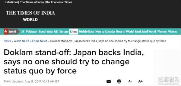 “洞朗站队:日本支持印度,任何人都不应该试图以武力改变现状”。(图:印度时报)