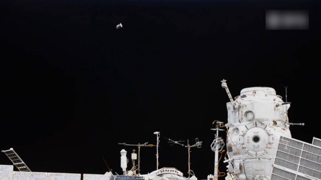 此次“发射”的小卫星被称为nanosatellites,介于1到10公斤之间。国际空间站一般使用专门装置来释放,图中可见小卫星越飞越远。(图片来源NASA中文)