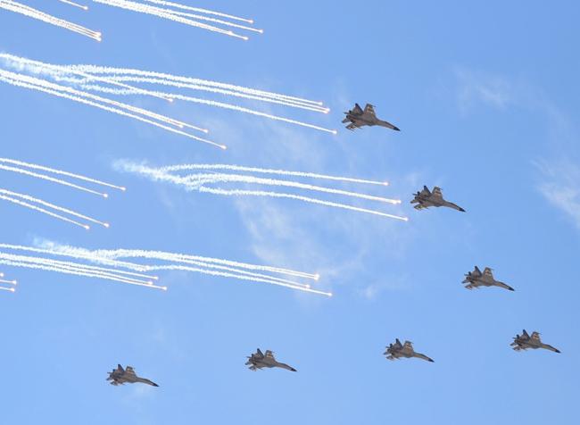 朱日和天空中的歼-11家族大机群如果放到几年前,会令人印象深刻