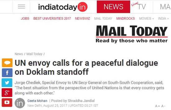 环球网记者注意到,《今日印度》在报道时将乔治·切蒂克的言论解读为联合国官方的表态,称“联合国已经敦促双方通过对话和平解决这一问题”。而事实上,针对中印洞朗对峙,到目前为止,联合国官方并没有作出过正式回应。