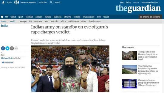英国《卫报》称,近日由“闪大师”辛格(Singh)领导的社会福利和精神组织“Dera Sacha Sauda”15万名成员,蜂拥至潘切库拉,等待其在当地时间25日的审判。为防止骚乱,印度北部已有两个州被封锁。