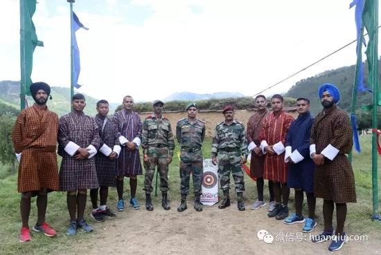 一批刚刚参加完射箭比赛的印度军人正在合影。驻扎在HAA的印军士兵在空闲时间经常会参加不丹传统体育项目-射箭。