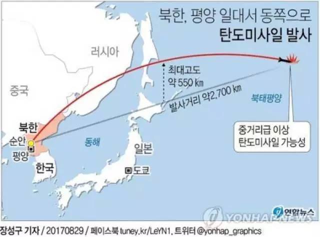 韩军联合参谋本部29日表示,朝鲜于当天早上5点57分从平壤市顺安一带发射一枚弹道导弹并通过日本上空,飞行距离为2700公里,具体型号不详。导弹飞行最高高度为550公里,经过日本上空后落入北太平洋海域。