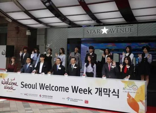 ▲资料图片:2016年9月29日,在韩国首尔星光大道前,首尔市政府及观光届嘉宾与韩国明星,在针对中国游客举办的“欢迎周”活动开幕式上合影。