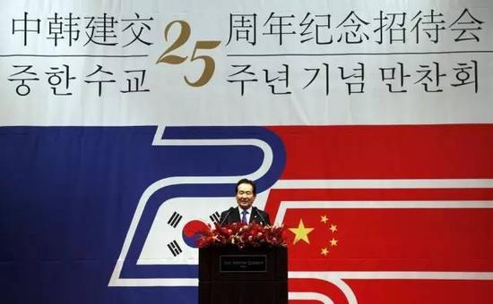 ▲8月24日,韩国首尔,韩国国会议长丁世均在中韩建交25周年招待会上致辞。