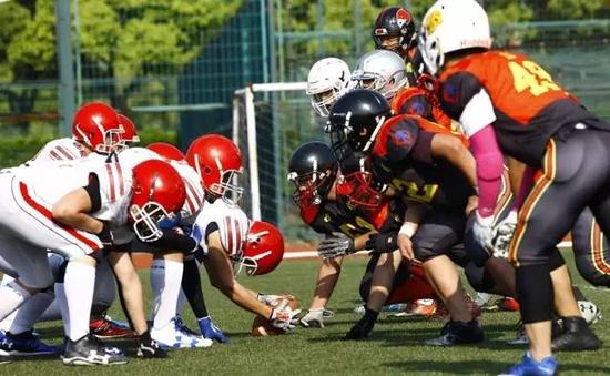 ▲资料图片:4月29日,中韩大学生美式橄榄球友谊赛在上海举行,图为中国(右)与韩国大学生联队球员在比赛中对阵。