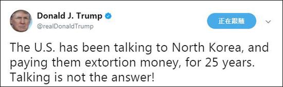 据CNBC报道,30日,特朗普在推特上警告:“过去二十五年,美国一直(试图)与朝鲜对话,还被勒索。对话不是解决之道!”