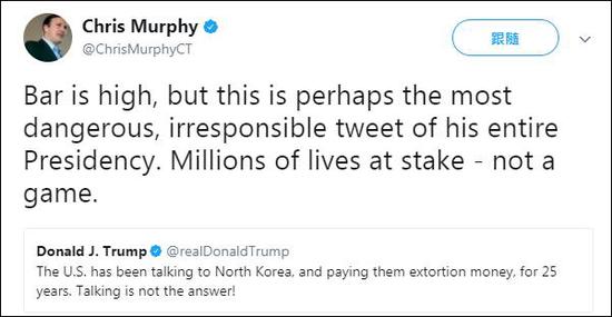 特朗普谈朝鲜的推特也招致一些批评。民主党参议员克里斯·墨菲(Chris Murphy)在推特上称:“大棒令人兴奋,但这条推特也许是特朗普整个总统生涯中最危险、最不负责的一条。千百万人命悬一线——这可不是个游戏。”