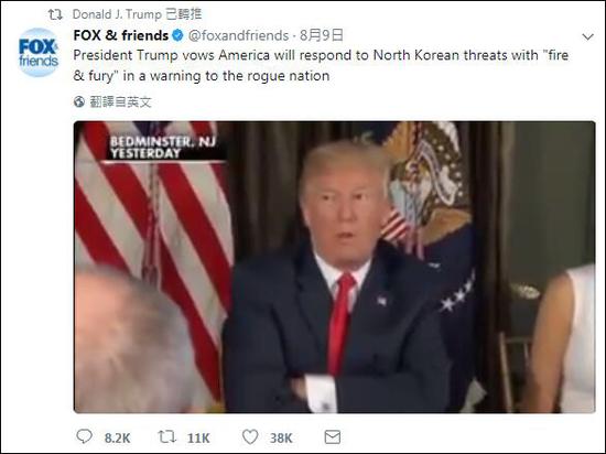 8月8日,特朗普曾表示如果朝鲜继续升级核威胁,美国将以世界前所未见的“烈火般的暴怒”予以反击。