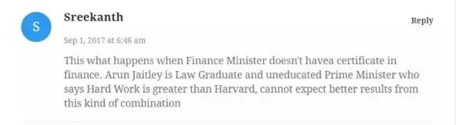 ▲ 这就是财政部长不懂财政的结果。Arun Jaitley是法学出身,没上过学的莫迪总理说“努力工作好过哈佛学历”。这种组合下,我们别无期待。