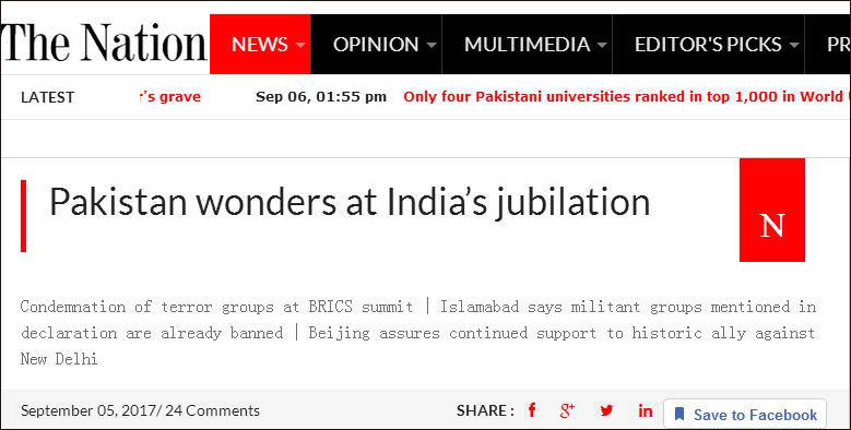 对于印媒“外交胜利”的说法,《国民报》表示印度“没什么值得庆祝的”,巴印两国的专家也认为这并不代表中国对巴政策的改变。巴基斯坦提醒印度称,金砖宣言同样提到了巴基斯坦塔利班运动,后者在巴基斯坦实施了多起恐怖袭击,巴基斯坦声称有证据证明其活动得到了印度机构的支持。