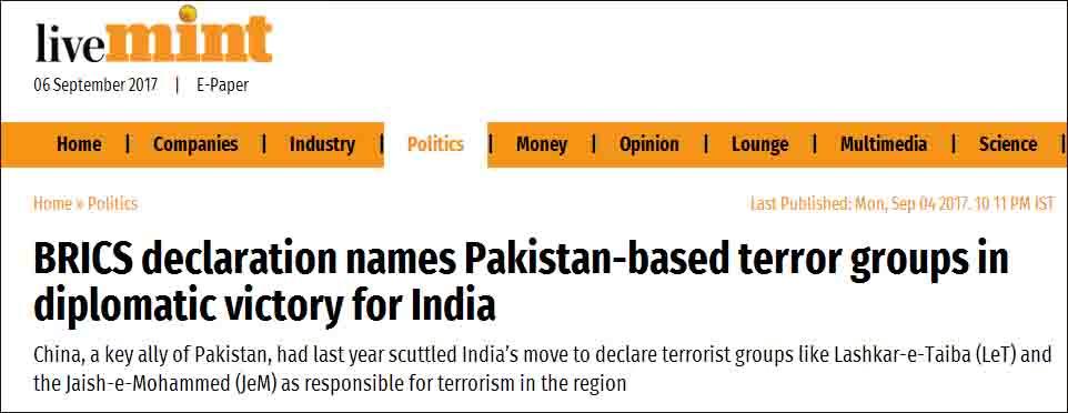 印度报道认为,虽然宣言在提及“虔诚军”和“穆罕默德军”时,没有直接点名巴基斯坦,但是印度外交部官员强调称,这是“首次(在金砖宣言中)谈及这几个恐怖组织”,总理莫迪在会晤中多次提及反恐议题。印度分析人士也对此表示欢迎,该国前外交部长称,(宣言这部分内容)证明印度外交政策是有效果的。