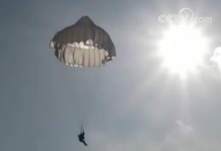 随着离机指令的下达,特战队员依次跳出机舱。由于空中风向多变,风速过大,降落伞在空中不容易控制方向。