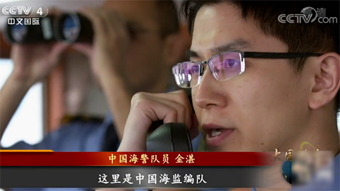 中国海警队员金湛说,日本海上保安厅巡逻船,这里是中国海监编队,中国海监编队在中国管辖的海域进行巡逻,你方船只侵入了我国的管辖海域,请遵守法规。