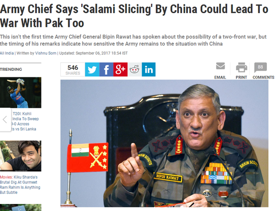 [环球时报-环球网报道 记者 王盼盼]印度多家媒体7日报道称,洞朗对峙刚刚结束,印度陆军参谋长拉瓦特6日在一个军方智库的演讲中称,印度必须时刻准备好“两线作战”——中国正像“切香肠”一样占领印度领地,而巴基斯坦则会趁火打劫。这不是拉瓦特第一次发表类似好战言论。今年6月,他还曾叫嚣印度在为“2.5线战争”做准备,即同时应对中国、巴基斯坦和国内的安全威胁。之后,印度大吉岭地区爆发骚乱。