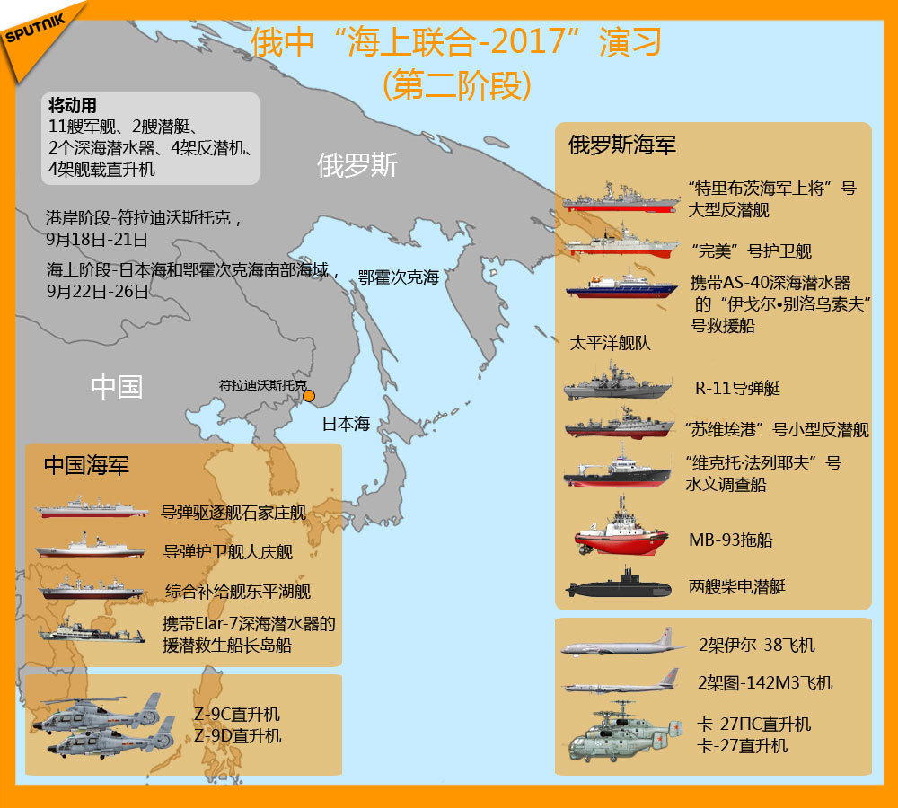 【环球网军事9月19日报道】中国海军舰队周一抵达符拉迪沃斯托克参加俄中第二阶段的“海上联合-2017”演习。第二阶段始于9月18日,止于9月26日,地点在俄罗斯太平洋舰队基地。岸上演习18-21日在符拉迪沃斯托克举行,其中两国海军陆战队将进演练。海上演习将于9月22-26日在鄂霍次克海南部举行。俄罗斯军事专家瓦西里·卡申在9月18日在卫星网刊文文章将就此次联合军演的特点加一评述。