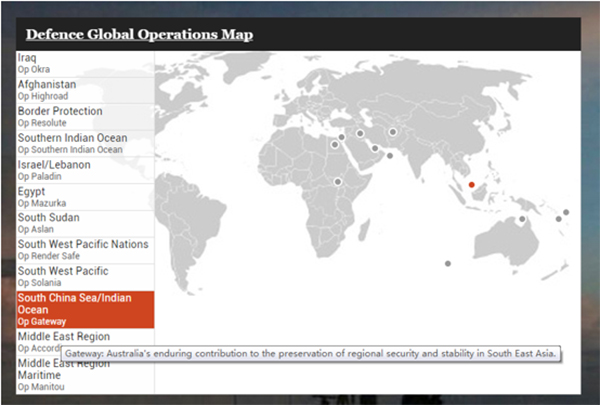 红点标注的是澳军在南海和印度洋的行动,代号为“门户”(Gateway)。在行动说明上,澳军方写道:该行动是澳大利亚的一项持久行动,旨在保持东南亚的地区安全与稳定,澳军将在北印度洋和南海进行持久监视和巡逻。