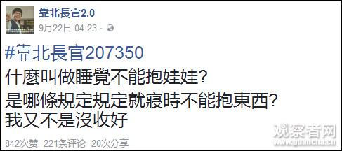 据台湾《中时电子报》9月23日报道,近日,台湾一名士兵在脸书上抱怨,表示就寝时长官不让他抱娃娃,让他相当不满: