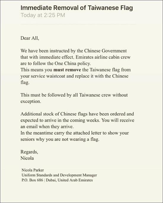 5月30日,有台湾网友在PTT上爆料,一封疑为阿联酋航空(Emirates)发给公司内部员工的邮件截图流出。