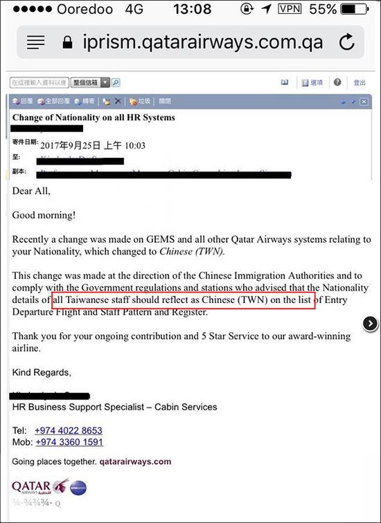 大约一周前,卡塔尔航空台湾机组员向台绿媒投诉,称其公司的台籍机组员发现,公司在未告知情况下将他们的“国籍”由Taiwanese改为 “Chinese (TWN)”。机组员向公司反应,可公司回复是应中国移民署要求。