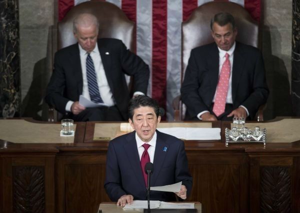▲资料图片:2015年,安倍在美国国会演讲拒就历史问题道歉招致美国议员抨击。