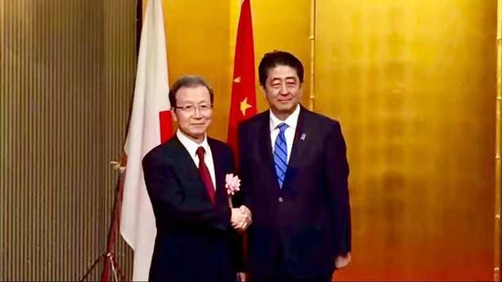 中国驻日本大使程永华与安倍首相在会场入口处合影。