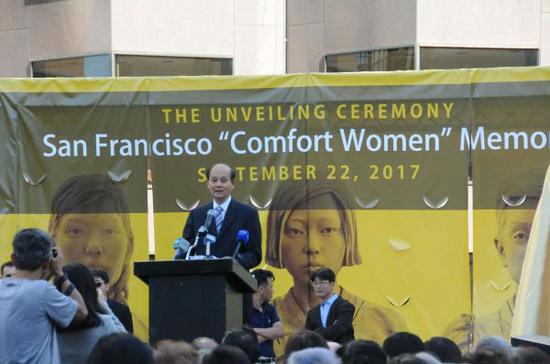 22日,中国驻旧金山总领事罗林泉在“慰安妇”纪念像揭幕仪式上致辞。
