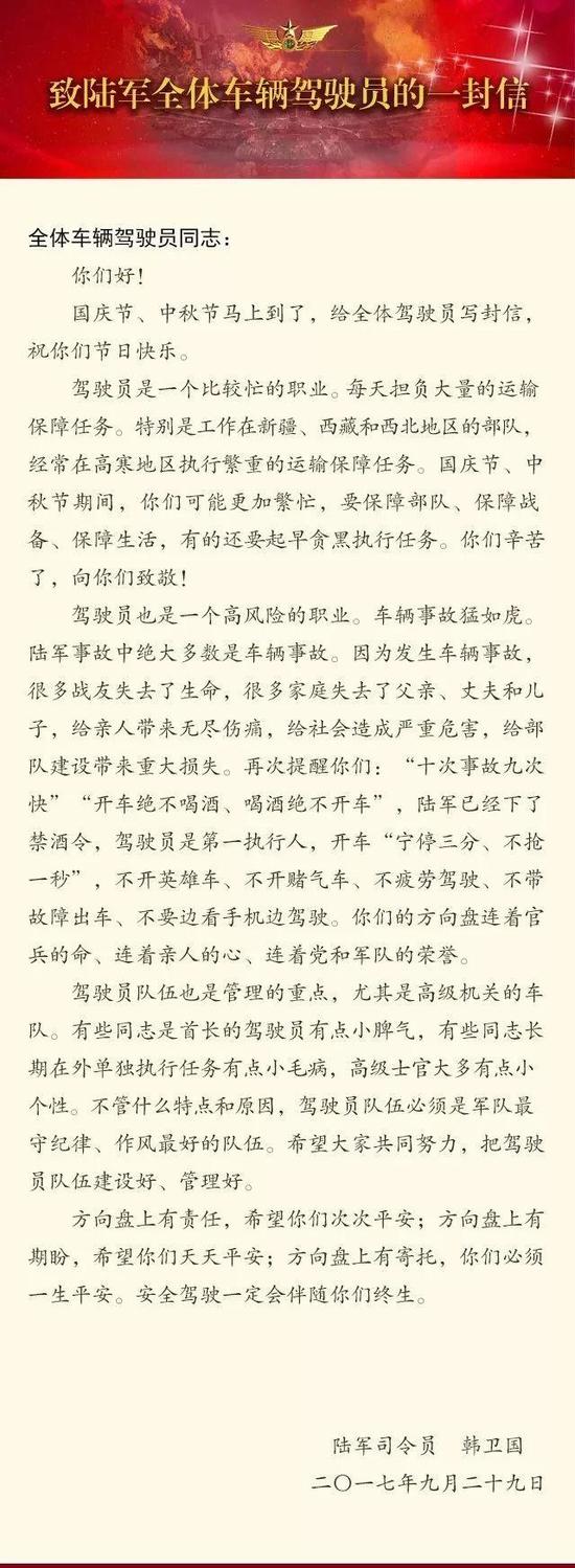 军事:陆军司令员写给陆军车辆驾驶员一封信称开车绝不喝酒