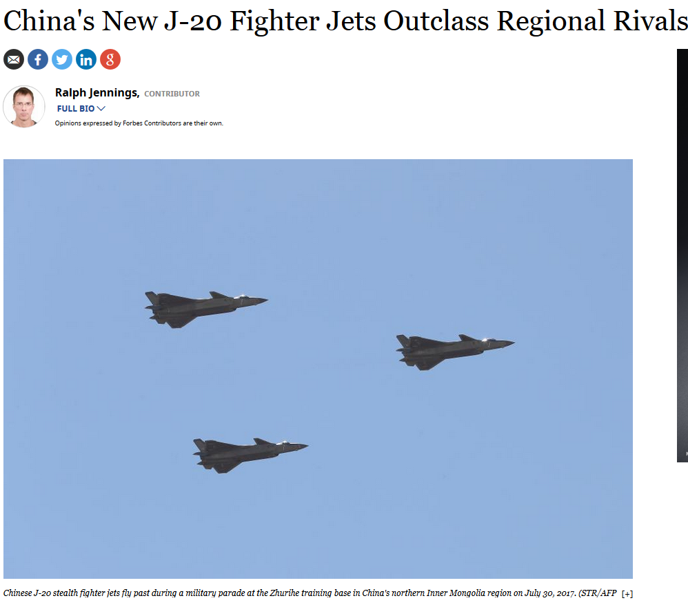 【环球时报-环球网报道 记者有马】“中国最新的歼20远胜地区竞争其他对手”,美国“福布斯新闻网”3日以此为题报道中国歼20战机正式列装部队的消息。该文称,这款远距离隐形战机毫无疑问是中国同级别战机中最先进的,它们能帮助解放军空军进行远距离截击,或被部署用于对地面基础设施目标进行第一轮打击。考虑到与周边邻国的复杂关系,中国很可能将把注意力聚焦在其陆地与海洋边界上最有可能爆发小规模冲突的地点。