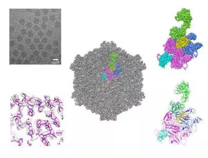 图为质多角体病毒CPV的冷冻电镜图像(左上)和质型多角体病毒衣壳三维重构(中)。重构结果中彩色部分为组成该病毒的最基本的非对称结构单元。右图展示该非对称单元的放大图(右上)以及构建的原子模型(右下)。左下图展示的是部分氨基酸的三维重构电子密度图以及构建的原子模型,可以很清楚地看见氨基酸侧链。