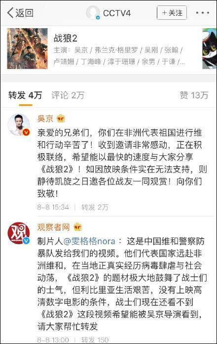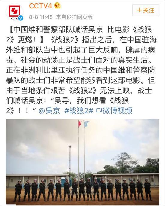 今年8月8日,战狼2上映的第14天,中国第五支驻利比里亚维和警察防暴队喊话《战狼2》,表达中国维和警察海外观影心愿,这条微博引起网民热烈反响。
