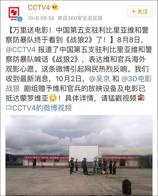 据中央电视台中文国际频道10月6日报道,10月2日,@吴京 和 @3D电影战狼 剧组赠予维和官兵的放映设备及电影已抵达利比里亚首都蒙罗维亚!