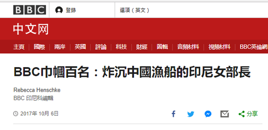 最后,值得一提的是,其实BBC的英文版网站并没有露骨地写明他们选择苏西是因为她“敢炸中国渔船”,其原标题是“她敢为了打击违法捕鱼而炸沉渔船”。