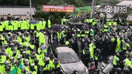▲资料图片:4月27日,韩美当局曾突袭式将两辆“萨德”系统发射车运抵星州高尔夫球场。图为“萨德”入场遭遇民众激烈阻挠。
