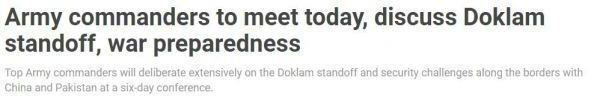 印度《经济时报》报道称,这场为期一周(9日至15日)的“印度陆军司令大会”集合了全印度陆军司令和总指挥等陆军骨干。“大会将就最近刚刚结束的洞朗对峙、中国在边界持续增兵以及其他来自中国和巴基斯坦的挑战等展开讨论,”报道继续指出,“会议还将商议如何提高战备,以应对中、巴两个邻国带来的挑战”。
