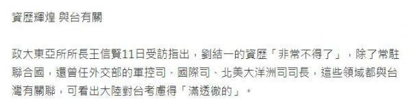 有意思的是,台湾学者王信贤11日接受台媒采访时,还拿刘结一的履历故意“吓唬”道:刘结一的资历“非常不得了”,除了常驻联合国,还曾任外交部的军控司、国际司、北美大洋洲司司长,“这些领域都与台湾有关联,可看出大陆对台考虑得满透彻的”。