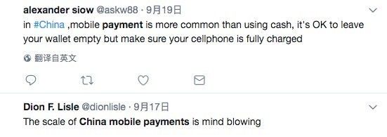 一位外国网友在推特上发评论感叹:你出门可以不带一分钱,但是手机电量得确保满满哒。而另一位网友则表示:中国手机支付简直让人蜜汁兴奋,仿佛打开了新世界的大门。