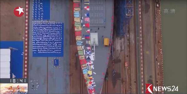 图为新型万吨大驱的直升机甲板,能看到甲板上有两条滑道,分别通往机库,这说明055舰设有2个机库,可搭载2架新型直-18直升机。