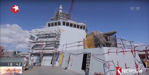 新型万吨级大驱逐舰建造时的画面,舰身外部还架设有脚手架。