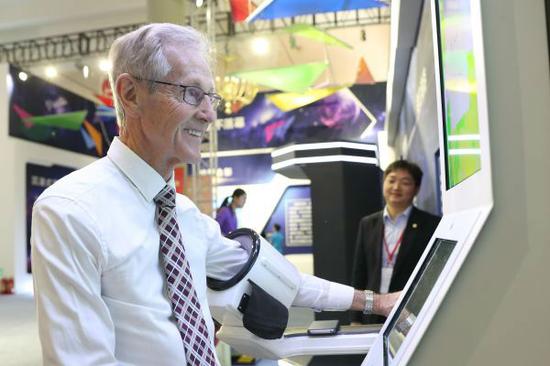 10月13日,一位来自澳大利亚的嘉宾在展览上体验健康检测。新华社